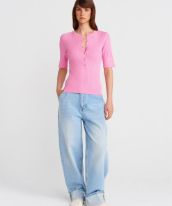 Bisiklet Yaka Fitilli Düğmeli İnce Triko Bluz-Koyu Pembe